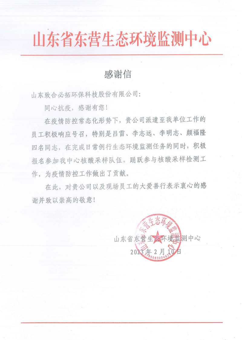 在疫情防控常態化形勢下,貴公司派遣至我單位工作的員工積極響應號召,特別是呂雷、李志遠、李明志、顏福隆四名同志,在完成日常例行生態環境監測任務的同時,積極報名參加我中心核酸采樣隊伍,踴躍參與核酸采樣檢測工作,為疫情防控工作做出了貢獻。