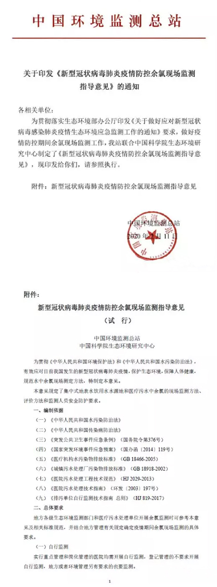 中國環(huán)境監(jiān)測總站發(fā)布《新型冠狀病毒肺炎疫情防控余氯現(xiàn)場監(jiān)測指導(dǎo)意見》